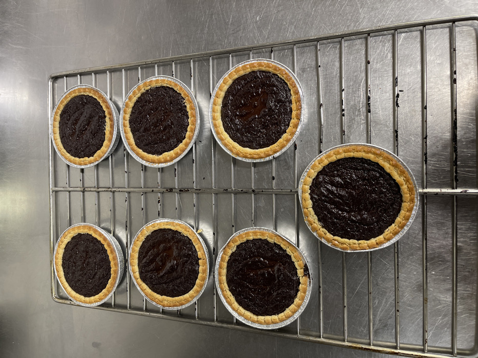 - "Seven freshly baked dark brown tarts are arranged on a silver-colored metal cooling rack, which rests on a brushed stainless steel countertop" by FM-ZqUPB2, licensed under CC BY 4.0