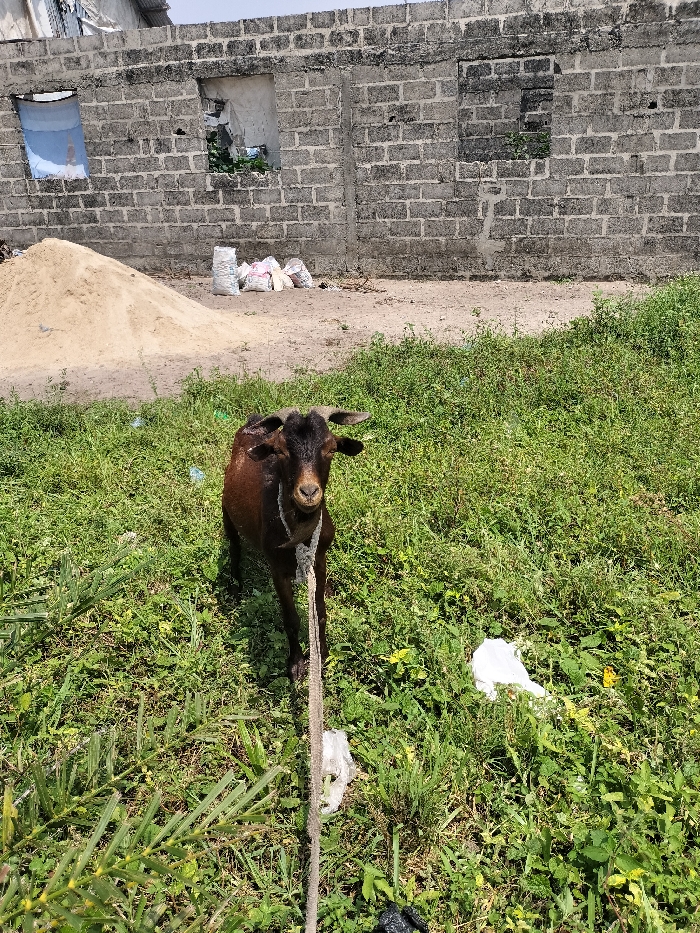 The scene is an outdoor environment in Igbologun, Nigeria, characterized by undeveloped terrain and a partially constructed building. In the immediate foreground and midground, a brown goat with black facial markings and small horns stands centrally, facing the viewer. A light-colored rope is tied around its neck, extending downwards. The ground beneath the goat and extending outwards is covered in dense, green, unkempt grass, interspersed with scattered white plastic refuse. Behind the grassy area, a patch of light brown dirt is visible. On the left side of this dirt patch, a prominent conical pile of light-colored sand is present. Behind the sand pile, several white and light-colored sacks are clustered on the ground. The background is dominated by a grey concrete block wall, likely part of an incomplete or derelict structure, featuring two rectangular openings, one on the left and one towards the center-right. A piece of light blue fabric is visible within the left opening. Above the wall, a clear, bright sky is visible. No human subjects are present.