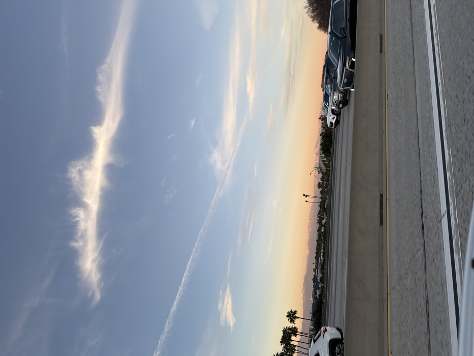 A highway view features cars parked along the roadside. In the distance, mountains rise with hints of snow. The sky displays light blue tones blending into yellow and orange hues near the horizon. Wispy clouds stretch across the sky, accompanied by an airplane contrail. Palm trees line the horizon.
