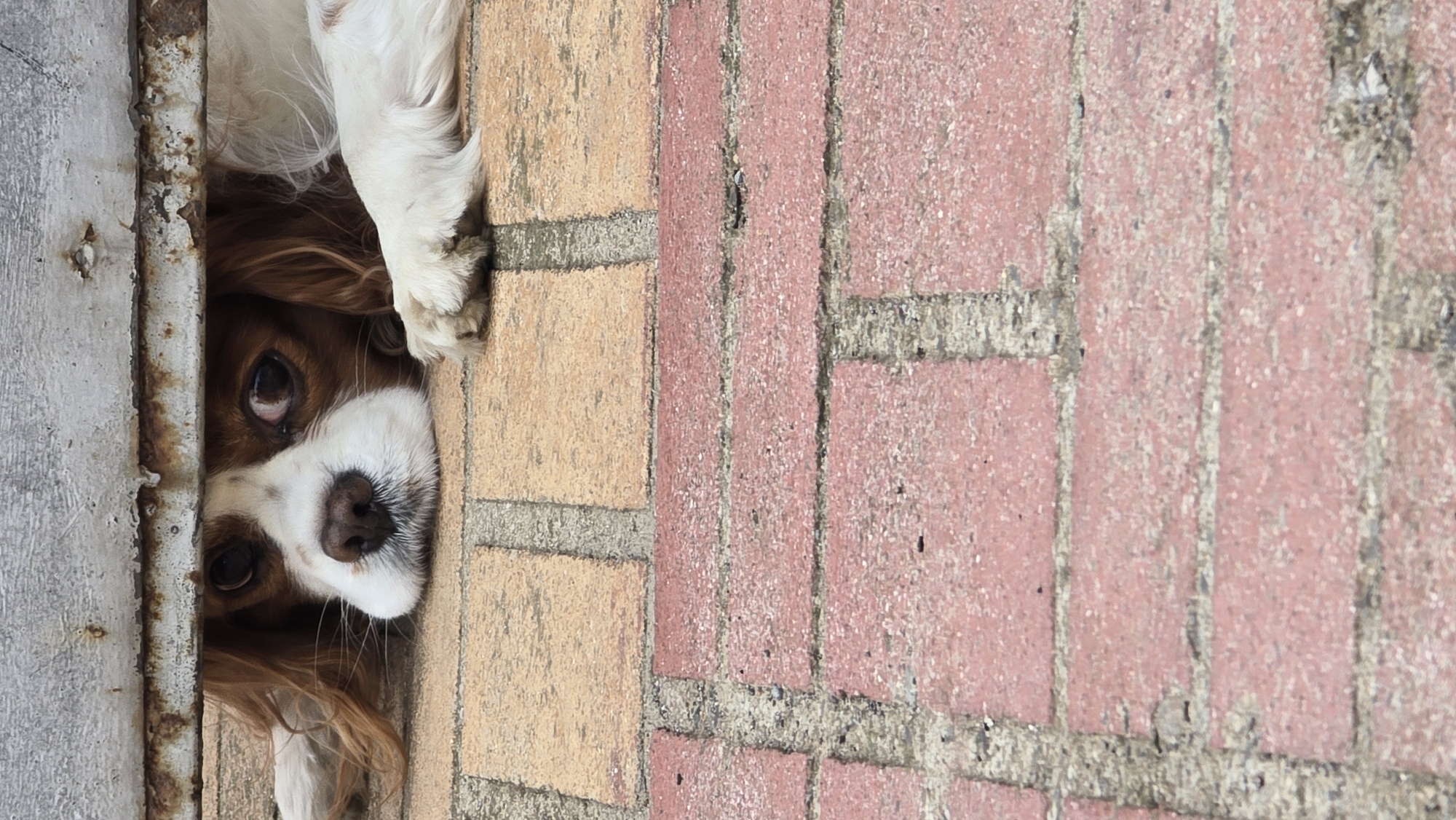 An outdoor scene in Mramor, Bulgaria, depicts a Blenheim-patterned Cavalier King Charles Spaniel lying on a paved surface. The dog's head, shoulders, and one white front paw are visible, peeking out from under a low, horizontal metal barrier. The barrier, positioned across the upper portion of the frame, is greyish-white with visible rust and chipped paint, suggesting age and exposure. The dog's muzzle is white with a dark nose, and its large, dark eyes look directly forward, partially obscured by reddish-brown fur. Its ears are long and wavy, matching the reddish-brown coloration. The visible front paw, predominantly white, shows minor dirt accumulation. The ground consists of rectangular paving bricks. The bricks immediately beneath the dog and the barrier are a light tan color, while the bricks in the lower half of the image are reddish-pink. Grey mortar lines separate the bricks, exhibiting some debris and wear. No other individuals or subjects are present.