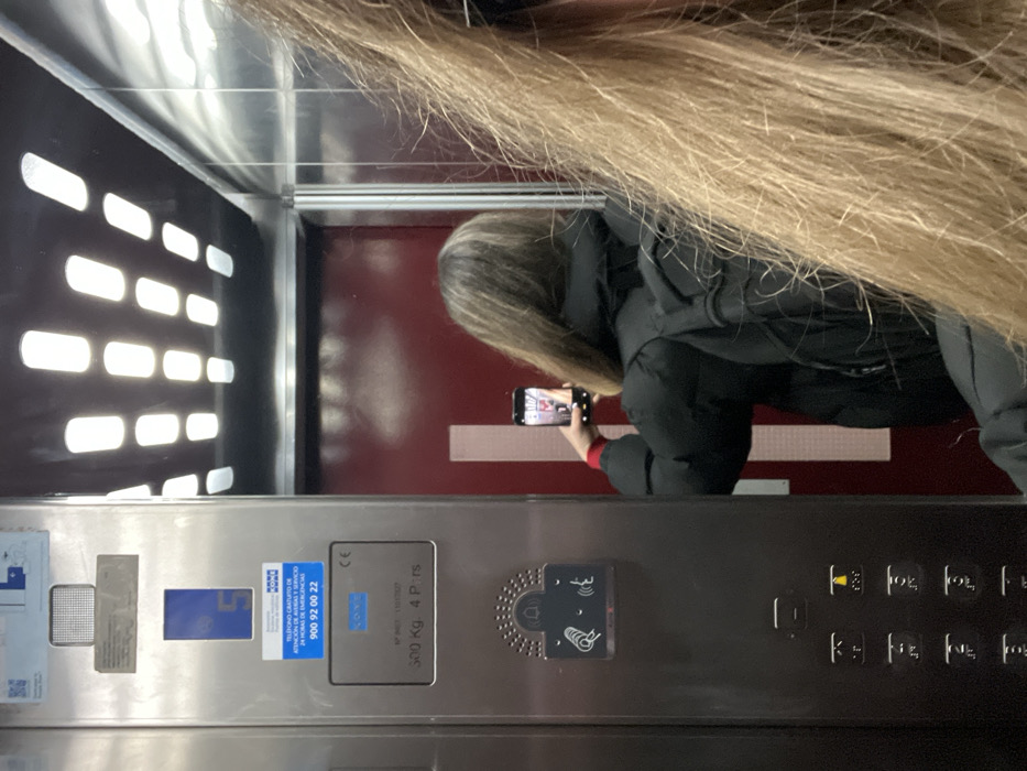 An interior elevator shot captures a person taking a photo with their smartphone. The lift's control panel is visible with various buttons and a contact information sticker including a phone number starting with 900 92 00 22. Weight information is also displayed. The elevator's inner design features horizontal bars or lighting. The person's blond hair is prominent in the foreground. The background shows a burgundy or red surface with horizontal lines.