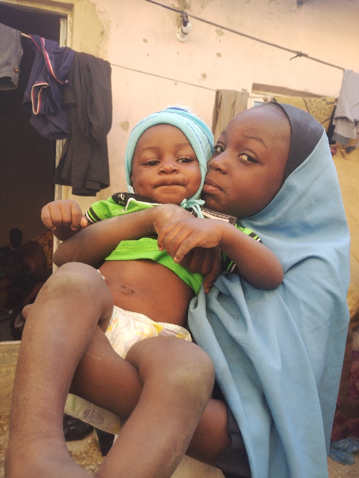 A young child, wearing a blue hat, green shirt, and diaper, is held by a slightly older child, possibly a sibling, who is wearing a light blue hijab. The older child looks at the camera with a serious expression. They are outside a building with clothes hanging in the background. A group of people can be seen indoors through an open doorway to the left.