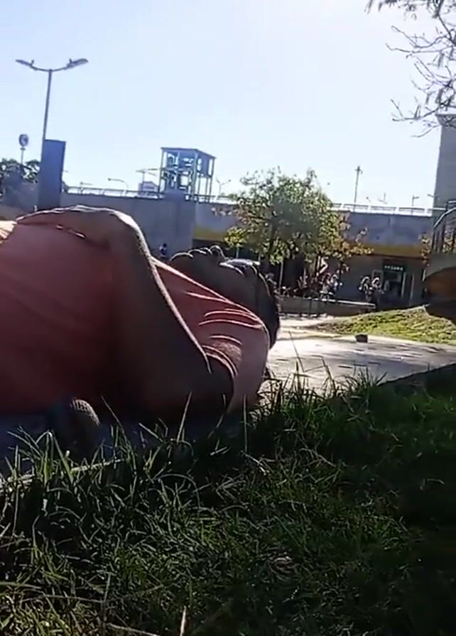 person lying on the grass, then someone next to them pulling items out of a black bag on the ground. The background shows a sunny day, trees, a bridge, and a building. The person lying on the grass has on an orange shirt and grey pants. The person opening the bag is wearing a grey shirt and black shorts, and is fair-skinned. There is also a white bag, a pair of shoes, and a phone on the ground next to them.