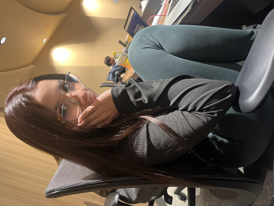 A woman with long, dark hair and glasses is sitting in an office chair. She is wearing a black long-sleeved shirt and dark leggings. Her hand is near her face. In the background, another person sits at a desk with a monitor and a bottle. The office has overhead lighting and the scene is rotated.