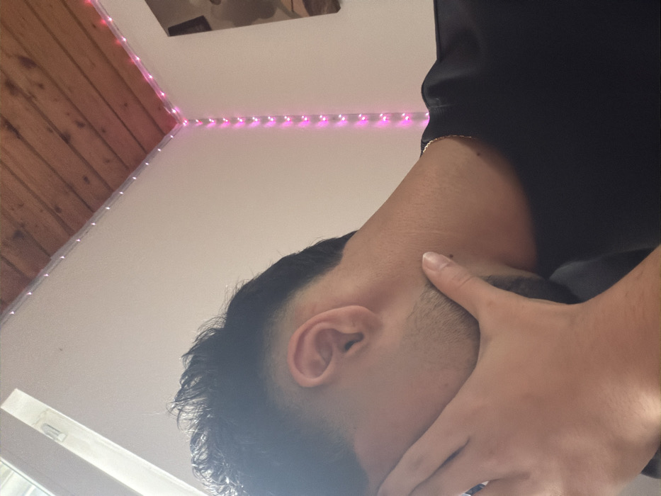 The image displays an unidentified individual, likely male, from a partial, upward-angled perspective. The individual has dark hair with a fade haircut and visible stubble along the jawline. A dark-colored shirt is worn, along with a thin gold-colored chain around the neck. The subject's left hand is positioned over the face, obscuring the eyes and upper cheek, with the thumb near the left ear. A digit, likely from the individual's right hand, is gently touching the right side of the neck/jawline area, near a small, dark mole. The background shows an indoor environment. The walls are light-colored. The ceiling comprises a flat white section and a sloped, wood-paneled section. Pink LED string lights are affixed along the intersection of the walls and the wooden ceiling, and also vertically down a wall corner. A portion of a window frame is visible in the upper left. An indistinct, dark object, possibly a framed item, is partially visible on the right wall. The image provides no specific visual cues to identify the location as Tuttlingen, Germany.