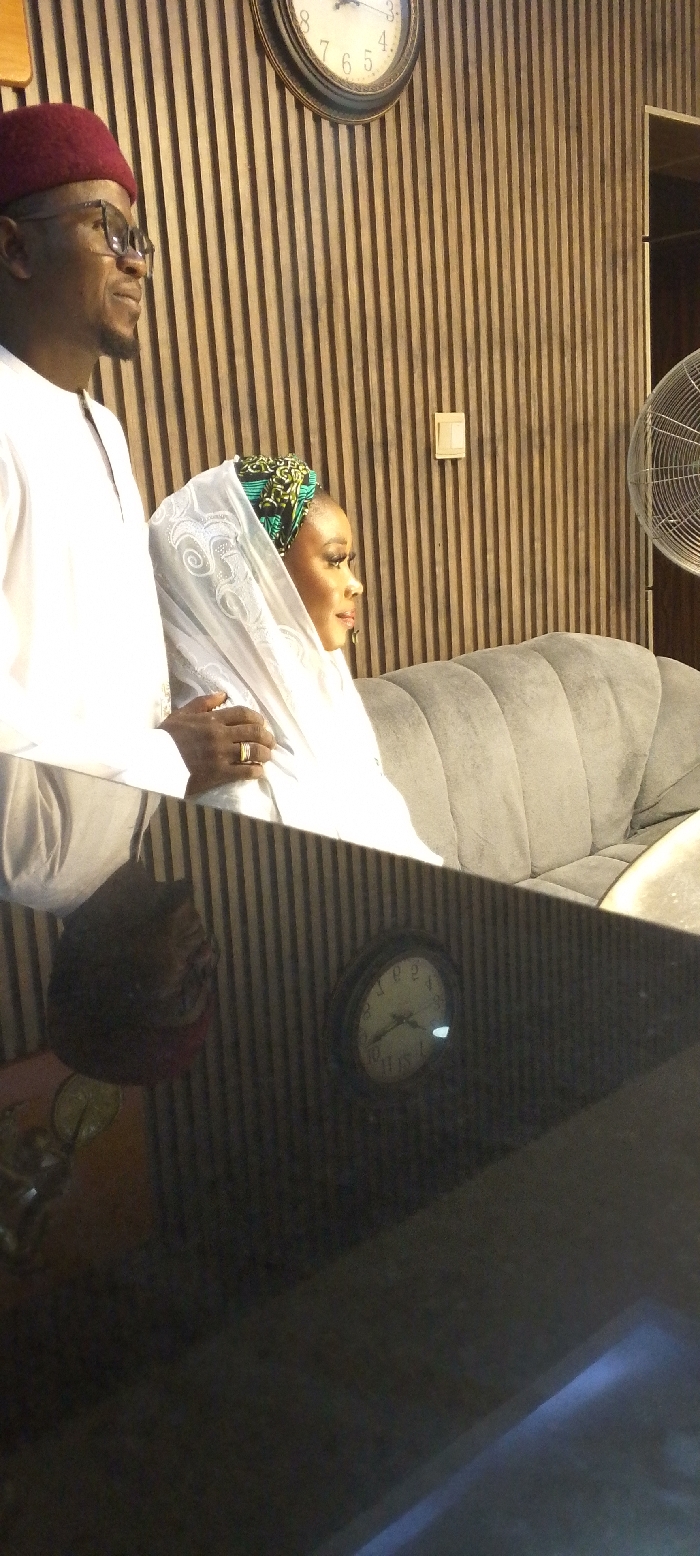 The image displays two adults, a male and a female, situated in an indoor environment. The male, positioned on the left, wears a white long-sleeved garment and a dark red, rounded cap. He has dark-framed glasses and a beard, with a gold ring on his left hand, which rests on the female's upper arm. The female, seated to the right of the male, wears a patterned headwrap (teal, yellow, black) under a sheer white veil with white embroidered designs. Her face is visible in profile, showing makeup, and she wears a gold ring on her right hand. Both individuals are looking towards the right, outside the frame. The background consists of a wall clad with vertical light brown wooden paneling. A round, antique-style wall clock with Roman numerals is mounted on the upper left portion of the wall. A light switch is visible on the wall to the right of the clock. A grey, upholstered sofa with a tufted backrest is positioned behind the female. A metallic electric fan is partially visible on the far right. The lower half of the image is dominated by a dark, highly reflective surface, which mirrors the male's cap, the wall, and the wall clock. The location in Lokoja, Nigeria, cannot be ascertained from the visual evidence provided.