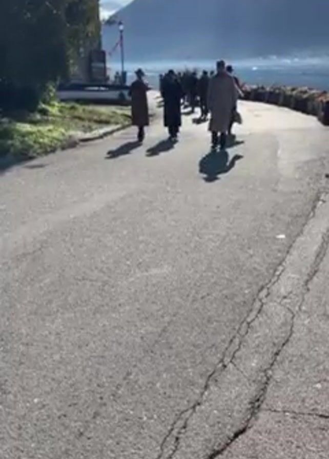 A group of people, dressed in long coats and hats, walk toward the camera on a paved road. To their left is a grassy area with trees. To their right is a stone wall separating the road from the water. In the background are mountains. The sky is blue with some clouds. The sun is shining. The shadows of the people are long and distorted on the pavement. Someone speaks indistinctly.