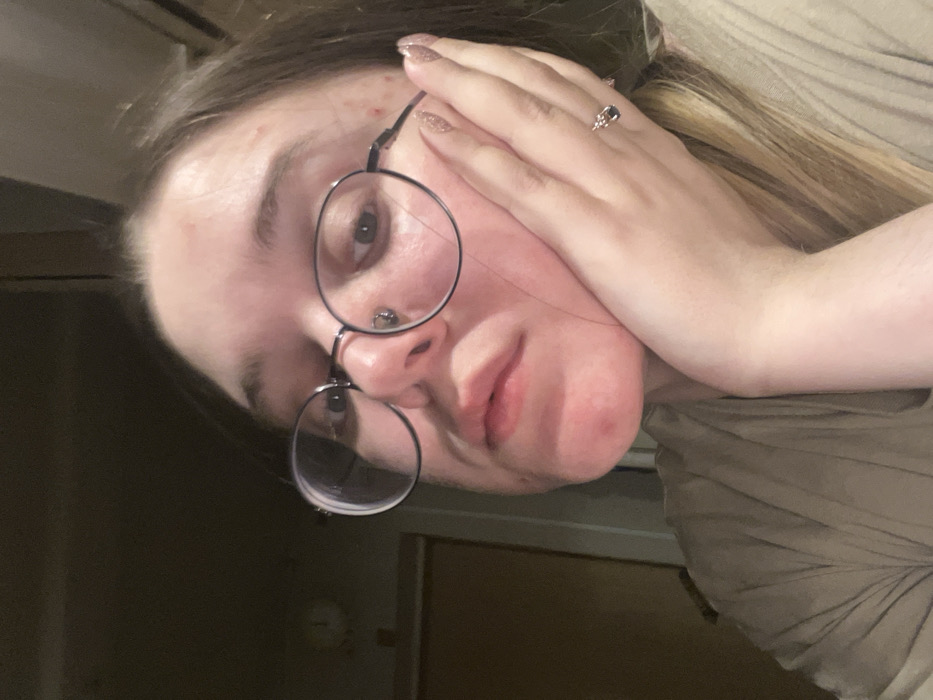 The image presents a close-up indoor portrait of a young female with medium-length brown hair, wearing round, dark-rimmed eyeglasses. Her facial skin exhibits multiple red blemishes on the forehead, temples, and chin. Her lips are slightly parted. Her left hand is positioned against her left cheek, with fingers subtly spread. Her fingernails are coated with a light-colored glitter polish, and a silver-toned ring featuring a dark, teardrop-shaped stone is visible on her left ring finger. She is clad in a plain, light-colored t-shirt. Her gaze is directed slightly off-camera to the right. The background is dimly lit and out of focus, revealing a circular, light-colored object resembling a wall clock on the upper left wall, above a darker vertical element that may be a door frame or furniture. The specific location of Kolomna, Russia, cannot be visually confirmed within the image.