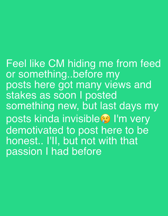 The image displays white text rendered on a solid medium-green background. The text reads: "Feel like CM hiding me from feed or something..before my posts here got many views and stakes as soon I posted something new, but last days my posts kinda invisible😭 I'm very demotivated to post here to be honest.. I'll, but not with that passion I had before". An emoji depicting a crying face (😭) is embedded within the text. The content expresses personal feelings of reduced online visibility and demotivation regarding content creation. The image provides no visual information to determine a specific physical location within the City of Zagreb, Croatia, or any other geographical area.