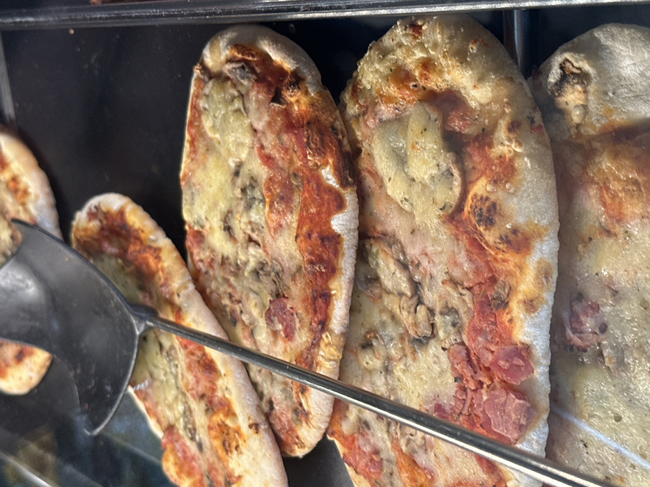 - "The image presents a close-up, elevated view of multiple individual-sized, oval pizzas arranged on a dark, flat surface, indicative of a food serving station in Chilly-Mazarin, France" by FM-iKko62, licensed under CC BY 4.0
