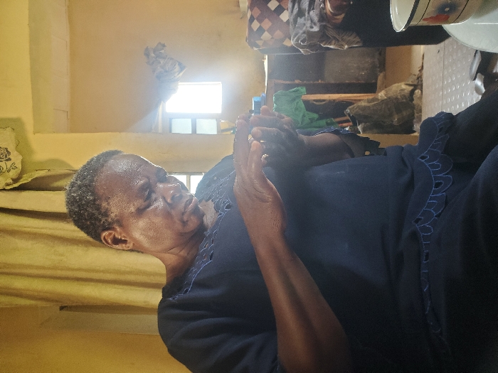 The image displays an adult individual, identified as a woman, seated indoors in a domestic setting within Minna, Nigeria