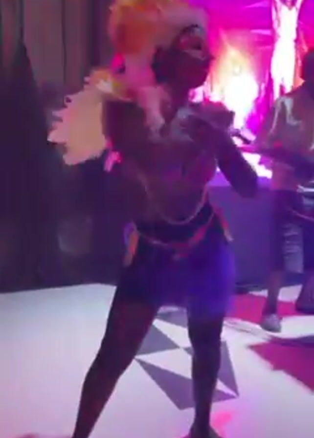 The video features a person dancing on a checkered dance floor at what appears to be a party or event. The dancer is wearing an elaborate costume, including a headdress of yellow, white, and orange feathers, a decorated top, and a dark skirt with a blue ruffle. They are moving energetically to music. Behind the dancer, a large screen displays images of people dancing. A man with a microphone stands to the side, seemingly part of a band. The room is illuminated by colored lights, predominantly green and purple, which enhance the party atmosphere.