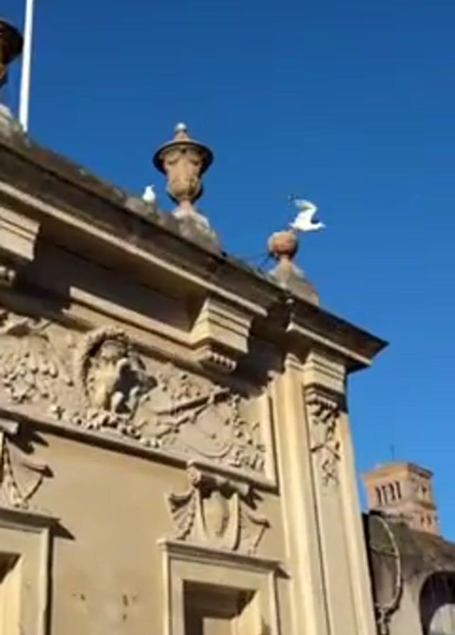 man playing a classical guitar in front of a building that appears to be undergoing renovation. The building has intricate stone carvings and is topped with decorative urns. There are white seagulls perched on top. A brick tower with a cross on top is visible behind the building. The man is sitting in a folding chair and is dressed casually in jeans and a gray shirt. There is a bicycle nearby. A banner with text and a picture of the building covers construction materials. The sky is a clear blue.