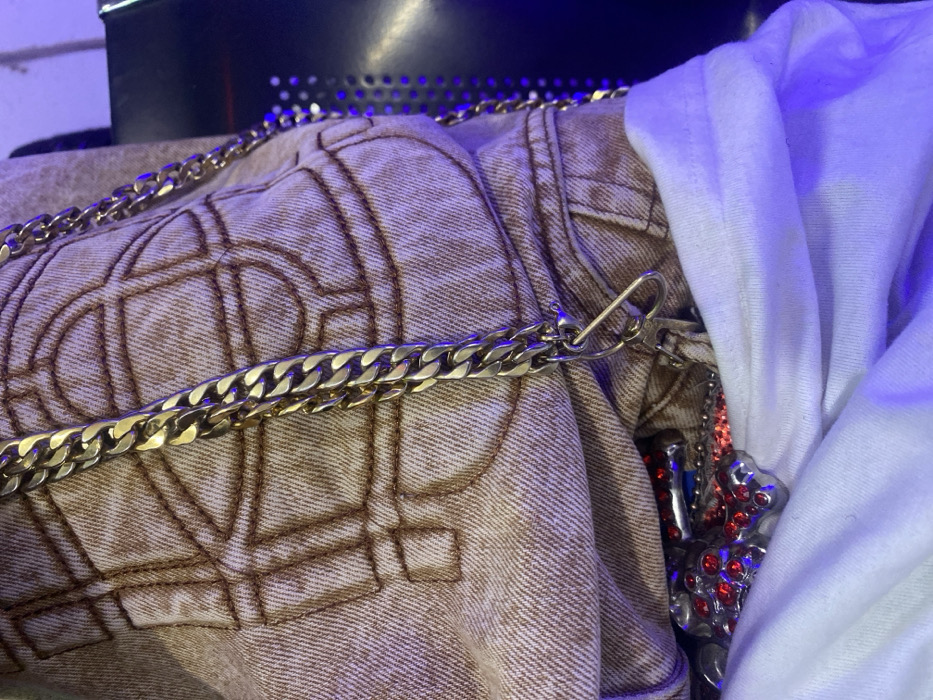 The image depicts a close-up, angled view of an individual's lower torso and upper leg area, situated in Jos, Nigeria. The subject is wearing light brown or tan denim fabric, which features an embossed or stitched repeating pattern, possibly a stylized "V" or geometric motif. A thick, gold-colored curb link chain is draped across the denim, with a silver-toned snap hook attached near the lower portion of the visible denim. Beneath the denim, a white garment, likely a t-shirt, is visible. Partially obscured between the denim and the white garment is a silver-colored cross pendant, heavily encrusted with numerous small red gemstones. The scene is illuminated by an ambient blue-purple light source, casting a cool tone over the garments. The background is dark and indistinct, showing minor specular reflections. No specific actions or interactions are discernible beyond the person wearing the described attire and accessories.