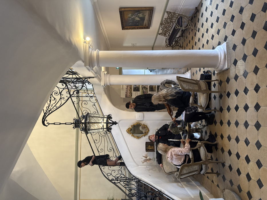 The image depicts the grand interior of a building in Vexin-sur-Epte, France, featuring a sweeping white plaster staircase with an ornate black wrought-iron railing. A large, decorative black metal lantern hangs from the ceiling near the staircase. The floor is tiled with a repeating pattern of octagonal pale tiles and smaller black square tiles. Two substantial white classical columns stand on the right, leading towards a hallway. A framed landscape painting and an ornate wrought-iron bench with a dark cushion are positioned on the right wall. A gold-framed mirror is mounted on the wall beneath the staircase. A promotional banner featuring architectural images is partially visible behind the columns. Five individuals are present in the scene. A female subject, dressed in dark clothing and a dark head covering, is descending the staircase, holding a small dark object. At the base of the staircase, a male subject with light hair, wearing a black puffer jacket, is seated on a light-colored upholstered settee, observing. Adjacent to him, two female subjects are seated in matching elegant upholstered chairs, positioned opposite each other around a small, ornate circular table. The female on the left, with blonde hair and a pink hooded sweatshirt, holds a silver flute. The female on the right, with long blonde hair and a black and white plaid skirt, plays a violin. A male subject with dark hair, wearing a black bomber jacket and a crossbody bag, stands behind the seated musicians, observing the scene.