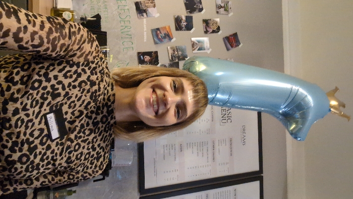 A smiling woman wearing a leopard print shirt and a name tag is positioned beside a blue balloon with a gold crown. Behind her, a wall features small photographs arranged randomly. Adjacent to the woman are framed menus listing items such as coffee, fresh juices, and smoothies. The background also includes a "SELF SERVICE" sign.