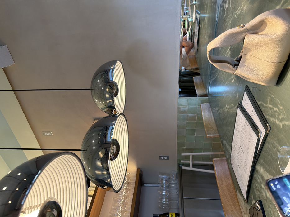 A restaurant table with a green marble top is visible. A beige purse rests on the table next to a closed menu. Seating consists of wooden chairs with pale green tiled walls nearby. Overhead, three chrome pendant lights hang, reflecting the surroundings. A shelf holds wine glasses and bottles. A phone is partially visible in the lower right corner of the image.
