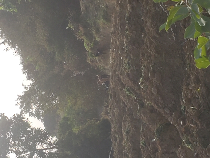 The image depicts an outdoor agricultural or rural scene in Mangu, Nigeria. The foreground consists of an expanse of dark brown, disturbed earth, characterized by numerous uneven mounds and furrows, suggesting recent tilling or cultivation. Small fragments of green vegetation are scattered across this terrain. In the midground, a group of four caprine animals, identified as goats, are present on the tilled ground. One goat, light brown in coloration, stands centrally, facing towards the right. To its immediate left, a darker-colored goat is partially visible. To the right of the central goat, two additional dark-colored goats stand. The animals appear to be stationary or moving slowly across the uneven ground. The background is composed of a dense accumulation of green trees and various foliage, forming a thick natural barrier or hillside that extends upwards and fills the upper half of the frame. The lighting conditions suggest diffuse daylight, with a bright, hazy sky visible above the tree line. A cluster of out-of-focus green leaves is visible in the extreme bottom right corner of the foreground.