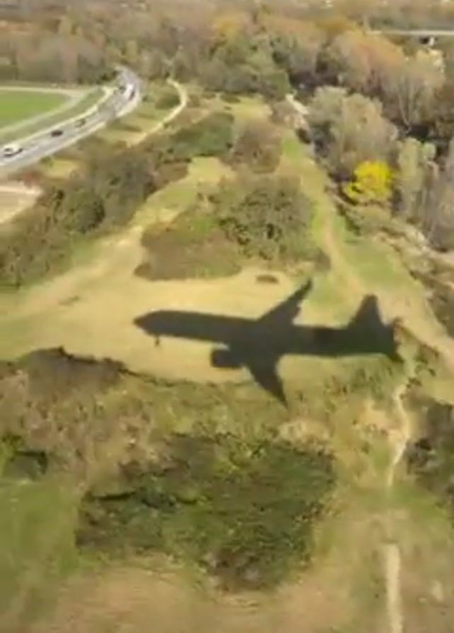A drone camera follows the shadow of an airplane as it approaches a runway