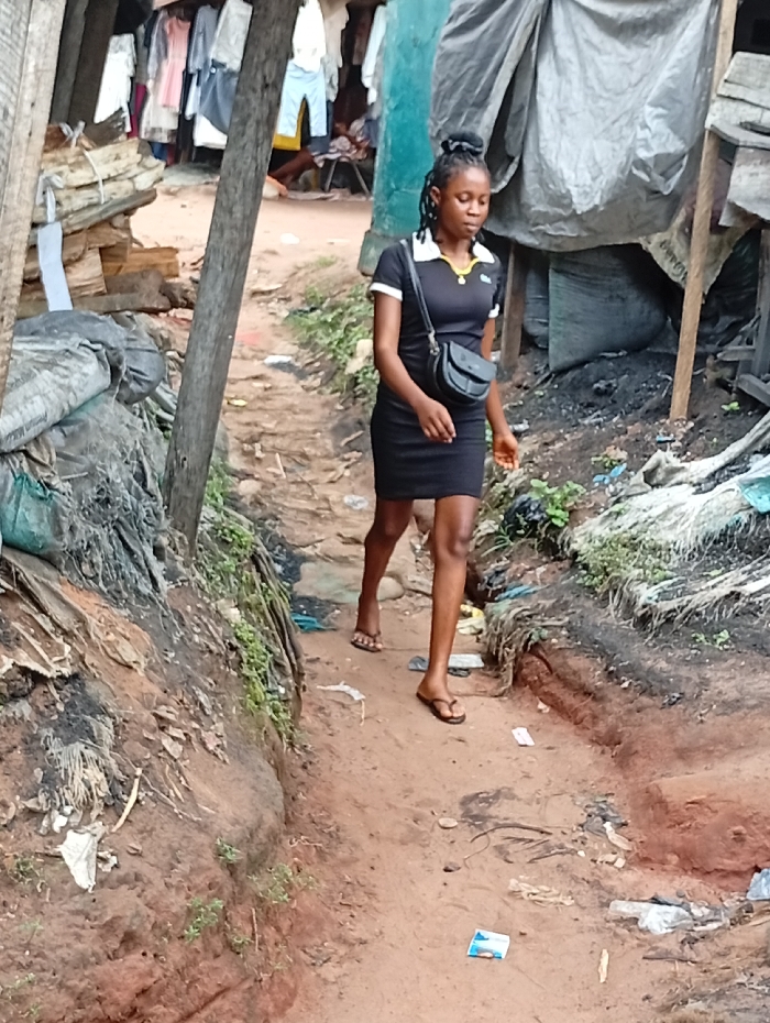 The image captures an unpaved, reddish-brown dirt pathway in Obosi, Nigeria, characterized by uneven terrain and scattered debris including plastic wrappers and refuse. A young, dark-skinned female, appearing to be in her 20s, walks rightward in the mid-ground, her gaze directed downwards. She is attired in a short-sleeved black polo-style mini-dress with a white collar and a yellow trim detail, complemented by a black cross-body bag and light brown flip-flops. Her dark hair is styled in a bun. To the left of the path, a stack of wooden planks and dark bags are visible, alongside a weathered wooden pole. The background features various makeshift structures, including a light blue/green wall, a large grey tarp covering an area, and multiple articles of clothing hung on lines, suggesting a market stall or residential laundry area. Indistinct human figures are discernible deeper in the background.