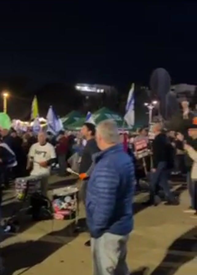 The video captures a nighttime protest or rally, with a crowd of people gathered in a public square. Many are waving Israeli flags, and a drumming performance is taking place. A particularly striking element is a large puppet of Donald Trump holding a baby-like figure of Benjamin Netanyahu. A sign written in Hebrew and English reading "Herzog you must listen" is attached to the Trump puppet. The overall atmosphere is charged with political energy, suggesting a demonstration with specific demands or messages directed at Israeli political figures. The presence of both Israeli flags and the politically-themed puppets indicates a combination of national identity and specific political critique.