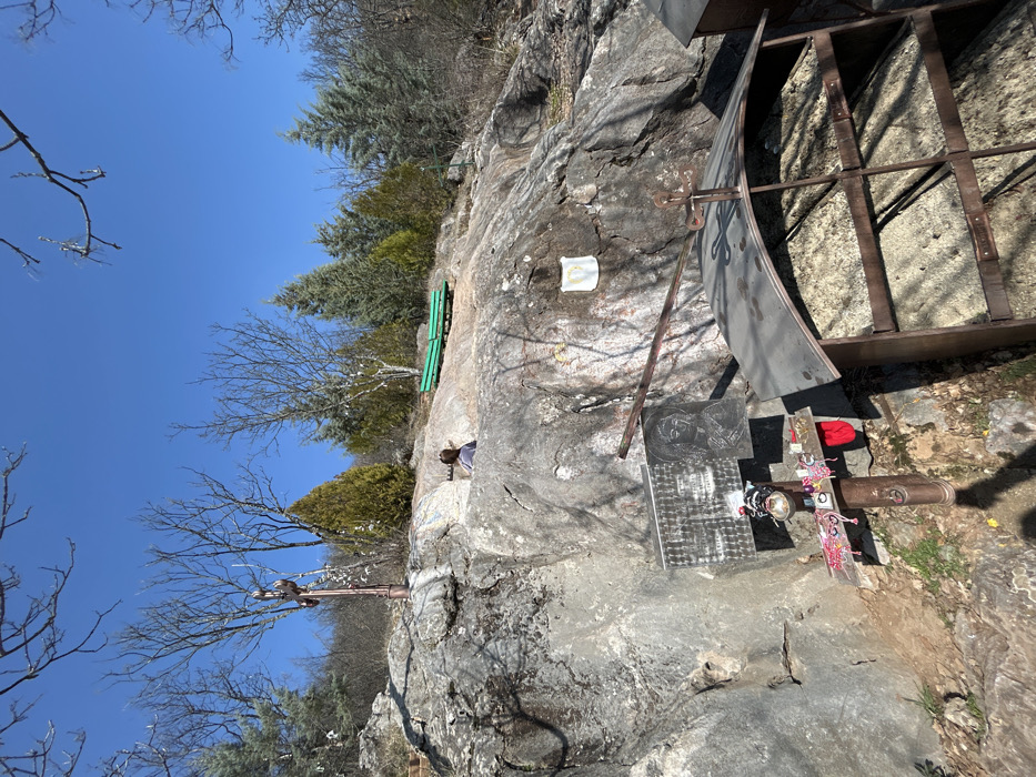 The image displays a rocky, forested hillside in Starozagorski bani, Bulgaria, under a clear blue sky with bright sunlight casting distinct shadows. The terrain is characterized by large, grey rock formations and sparse ground vegetation, with a mix of bare deciduous trees and several evergreen conifers. At the upper left, a prominent, ornate metal cross stands on a rock outcrop. To the right of the cross and slightly higher, a person with dark hair, wearing a light-colored top, is seated on a rock, facing away from the viewer towards two connected green park benches situated on a flatter rock surface. Lower on the main rock face, to the left, a dark rectangular plaque with white text and an etched image of a religious figure is affixed. Below this, a vertical brown post supports a small horizontal wooden shelf displaying numerous offerings, including multiple red and white bracelets, a small silver-colored bowl, and a miniature black boot. To the right of these offerings, a metal structure with a curved, arched roof, topped with a small metal cross, is present. Its interior contains a light-colored granular material, likely sand or small pebbles. A similar, partially visible structure is positioned further to the right. A white rectangular object with yellow markings is also attached to the rock face in the mid-right section.