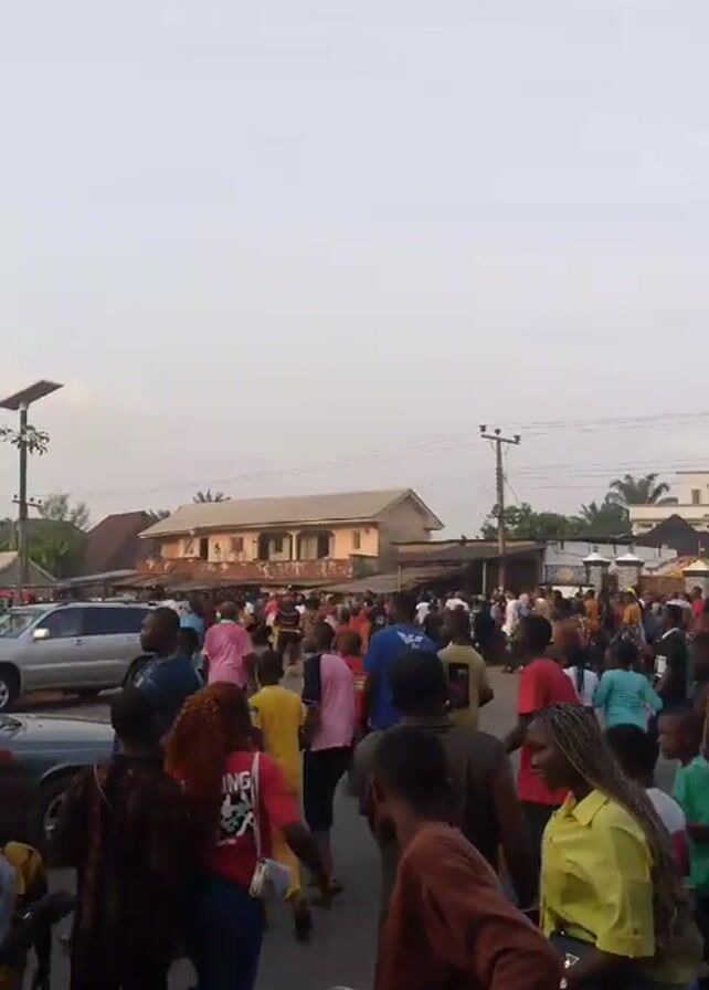 large crowd of people walking down a street. The crowd is diverse in age and appearance. People are wearing a variety of clothing, including brightly colored outfits. Some are walking towards the camera, while others are walking away. Several buildings and cars are visible. A sign for a church is also visible. Power lines and utility poles run above the street. The sky is overcast.