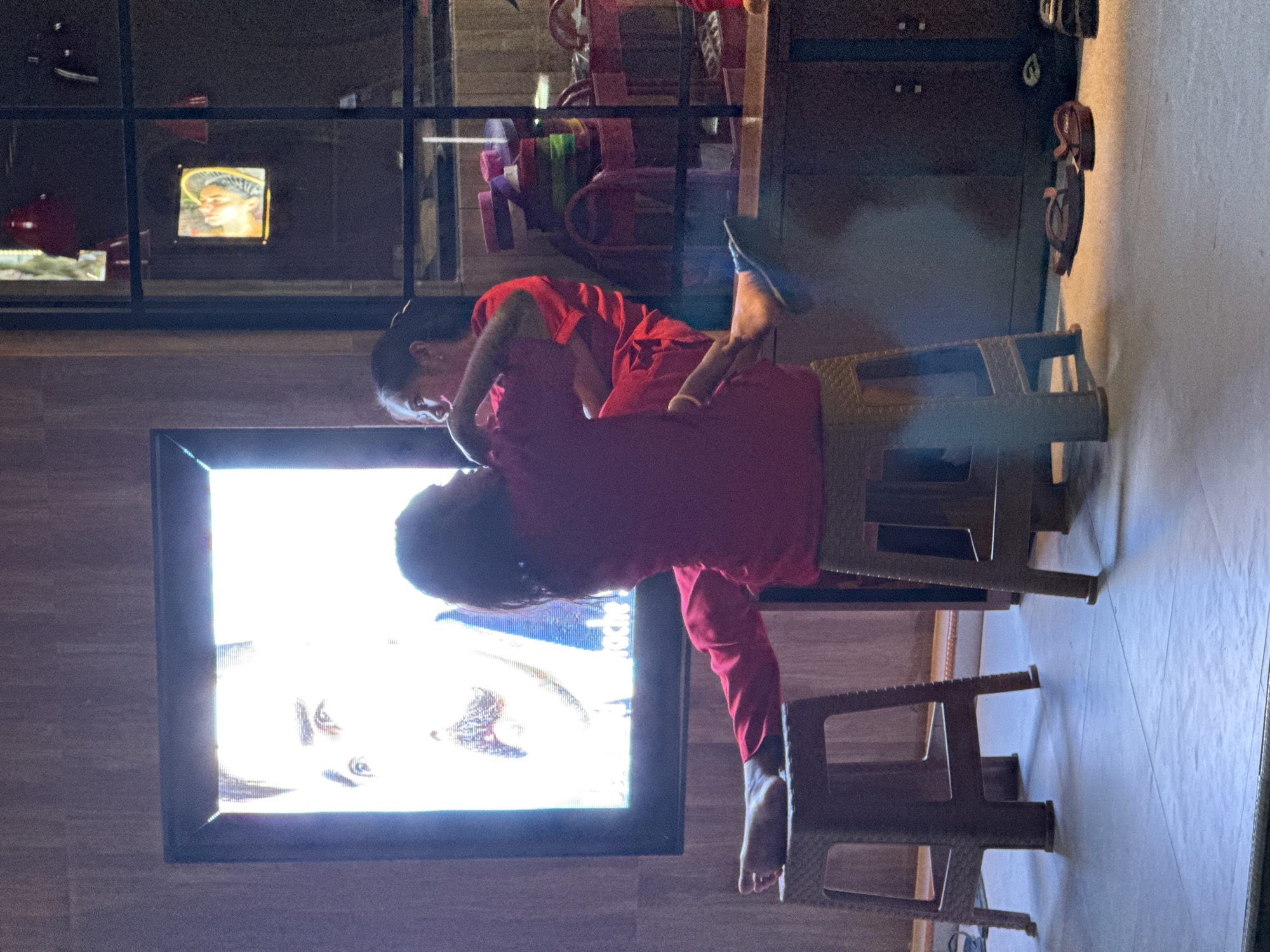 A woman and a child, both in red clothing, are perched on plastic stools indoors in Pererenan, Indonesia