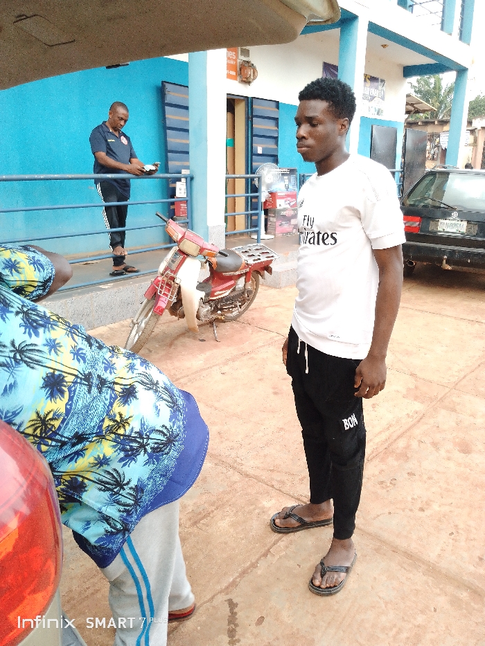 A young man in a white "Fly Emirates" t-shirt and black sweatpants stands outside near a building. He is wearing sandals. A motorcycle is parked nearby, and another man in a dark uniform is reading something while standing by a railing. A car is visible in the background, and parts of two other individuals are also in the frame. The building has blue and white accents.