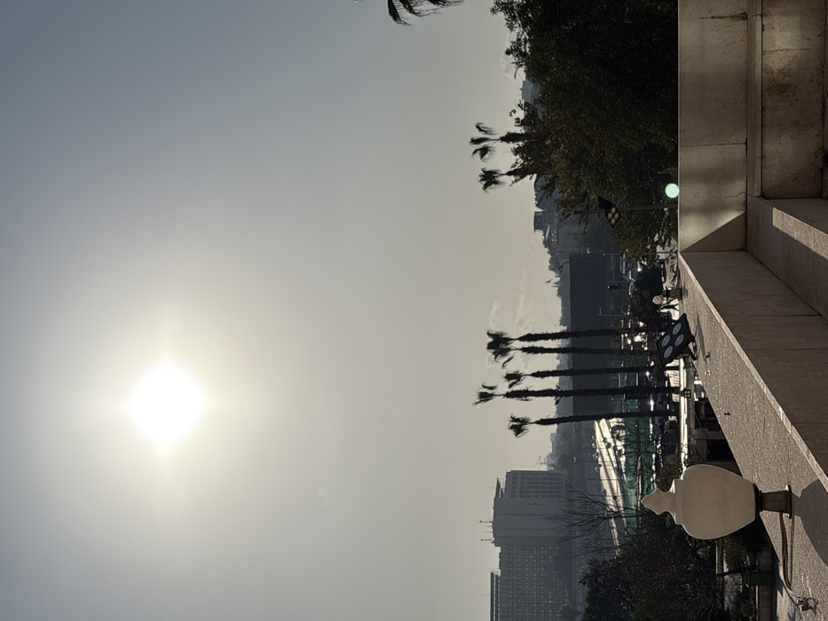 An outdoor, elevated urban scene in Al-Muhajerin Municipality, Syria, captured under bright, hazy daylight. The sun, a brilliant white disc with a distinct halo, dominates the upper-left sky. In the foreground, a light-colored, multi-tiered concrete balustrade extends across the bottom of the frame, casting long shadows. An ornamental white urn-shaped lamp fixture is positioned on the balustrade in the lower-left. Further along the balustrade, a dark, rectangular floodlight is visible, angled upwards. The midground features a multi-lane road or highway curving from left to right, populated by several vehicles including cars and larger commercial vehicles. Multiple tall, slender palm trees with dark trunks and sparse green fronds are centrally located, silhouetted against the bright background. To the left of the road, deciduous trees with bare branches are visible. Indistinct human figures can be observed on the street level, indicating pedestrian presence. The background consists of an urban landscape with numerous buildings. A large, multi-story building with a flat roof and multiple windows stands prominently on the far left. Additional buildings and structures are scattered across the distant hillsides and along the horizon. The sky is a uniform light gray-blue, brightened by the intense sunlight, and appears somewhat hazy.
