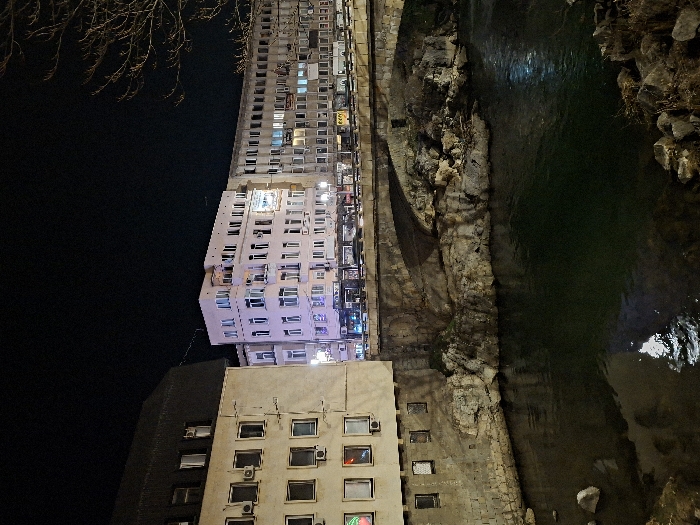 The image depicts an urban night scene in Gabrovo, Bulgaria, focused on a river spanned by a stone arch bridge, flanked by multi-story buildings under a dark sky. The river, likely the Yantra River, flows through the foreground with dark, reflecting water and visible rocky banks. On the left, a light-beige, multi-story building features numerous rectangular windows, several of which are illuminated, and multiple external air conditioning units. Its lower section meets the river with a stone foundation. Across the bridge, a light-colored (possibly white or pale pink) building rises multiple stories, showcasing numerous windows and balconies. Several illuminated signs are visible at its ground level, indicating commercial activity. To its right, a longer, grey-toned building with a uniform facade extends, presenting many rectangular windows, some internally illuminated. Ground-level storefronts with various signs, including a partially legible "easy" logo, are present. The stone arch bridge features a solid railing or parapet. Lights from street fixtures or passing vehicles are visible above the bridge structure, casting reflections on the water. No individuals or specific vehicles are distinctly identifiable. Bare tree branches are visible against the dark sky on the right side of the frame, suggesting a dormant season.