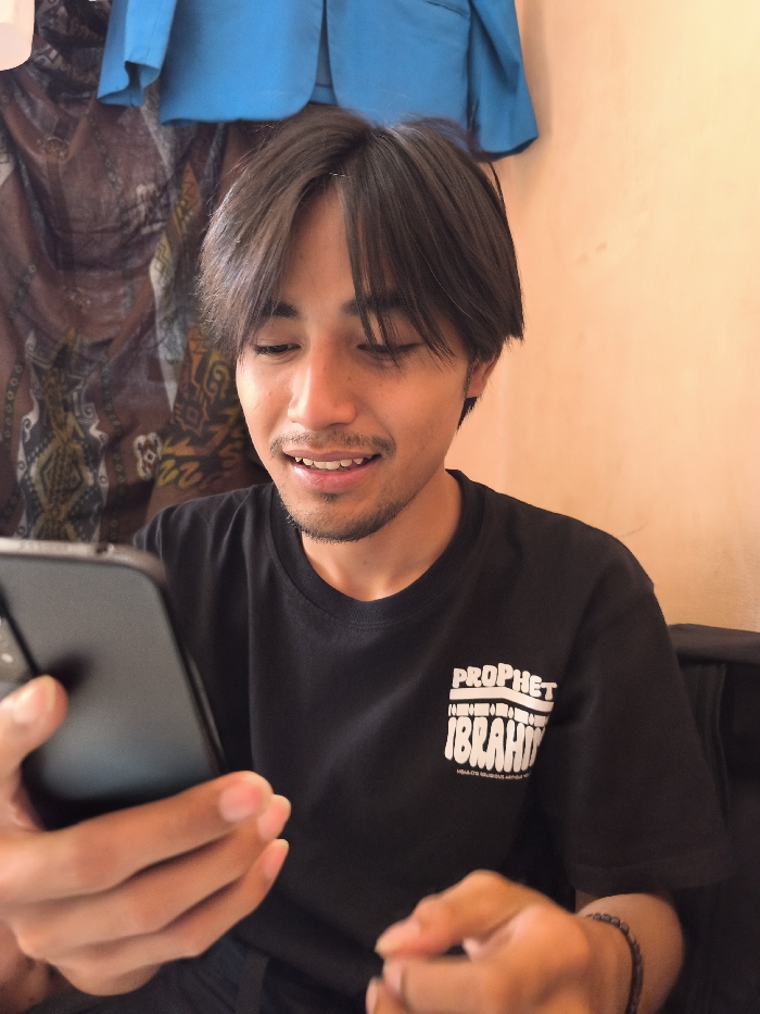 A young man with medium-length dark hair and light facial stubble is depicted from the chest up, seated indoors in Muka, Indonesia. He wears a black t-shirt with white text on the chest, which prominently displays "PROPHET IBRAHIM" above smaller lines of text. A dark-colored beaded bracelet is visible on his left wrist. He holds a black smartphone vertically in his left hand, looking down at its screen with a slight smile, mouth partially open. His right hand is visible with fingers slightly curled. The background consists of a light tan wall. To the left, a section of brown fabric with a traditional pattern is visible, and above it, a bright blue blazer or jacket hangs.