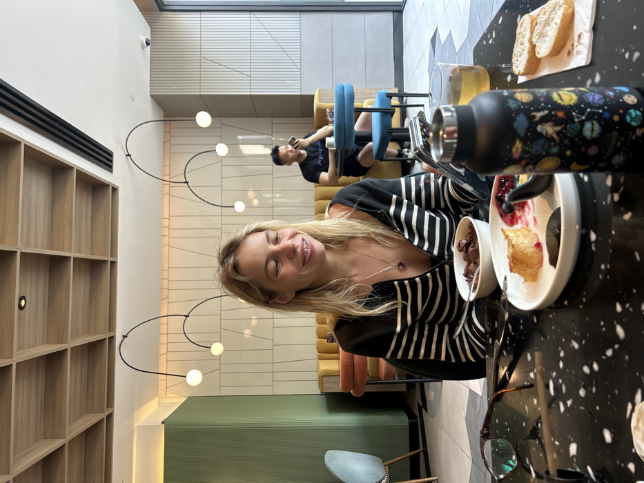 A woman with blonde hair and braces sits at a table with a plate of food and a bowl of cereal. In the background, a man sits in a chair, looking at his phone. A water bottle with a space design sits on the table next to a glass of beer and a plate of bread. The restaurant has a modern design with bookshelves and hanging lights.