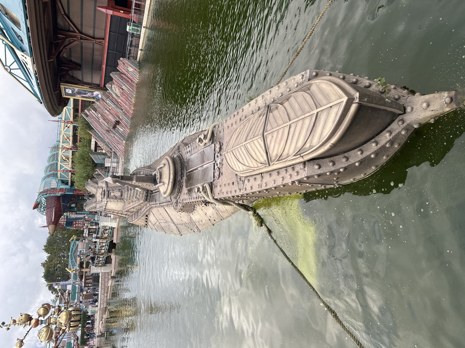 - "A large, bronze-colored, steampunk-style submarine model, featuring prominent rivets along its hull, rests partially submerged in murky green water" by FM-n6yWE2, licensed under CC BY 4.0