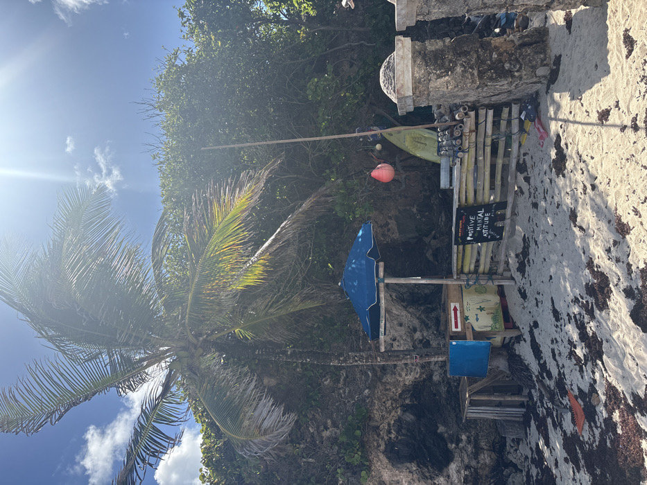 The image depicts a bright, sunny outdoor scene at a beachside location in Wellhouse, Barbados. The sky is a clear blue with scattered white clouds, and a strong sun flare is visible in the upper right quadrant. In the foreground, a sandy beach is visible, partially covered with patches of dark brown seaweed. An orange plastic rake with a wooden handle lies on the sand in the lower left. Dominating the left side of the frame is a tall palm tree with green fronds, casting some shadows. Behind the main structures, a rocky cliff face or heavily vegetated incline is visible, covered in dense green foliage and bushes. At the center of the image, a rustic, makeshift beach bar or stall is constructed primarily from wood and recycled materials. The left section of this structure features a small blue beach umbrella providing shade. Beneath it, a dark blue cooler or box rests on a wooden base. To its right, a light-colored wooden panel displays a painted scene of green aquatic plants and small marine creatures, with a red arrow pointing right and a small red sign above it. The right section of the stall consists of a wooden counter made from horizontal planks or logs. A black chalkboard sign, suspended from the counter, prominently displays "POSITIVE MENTAL ATTITUDE" in white text, with a small red logo above it. Behind this counter, a large quantity of stacked cylindrical objects, appearing to be empty aluminum cans or bottles, is organized. A yellow surfboard leans vertically against the back of the structure, to the right of the stacked items. A red buoy or float hangs from a rope near the surfboard, accompanied by a smaller, lighter colored hanging object. A tall, thin wooden pole extends vertically upwards from behind the counter. On the far right, two weathered, light-colored stone pillars or posts, possibly part of a gate or entrance, stand on the sand. A pink flip-flop and a small blue object are visible on the sand near the base of the rightmost pillar. No individuals are present in the scene.