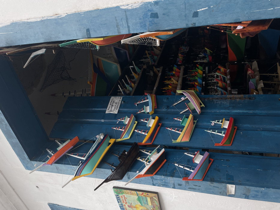 This image captures the open, weathered blue double doorway of an artisan shop in Paraty, Brazil. The exterior white stucco wall, typical of colonial architecture, is visible to the left of the doorway, displaying a framed, colorful folk art painting depicting figures by a body of water with boats. The left blue door panel is densely adorned with approximately 15 brightly painted, flat-bottomed wooden boat models, ranging in color from red, orange, yellow, green, blue, purple, black, and white, each featuring simple mast structures and cabins; some are suspended by thin lines, others appear directly mounted. A small white sign with black Portuguese text and a phone number (48 998493470) is affixed to the interior side of the left door. The shop's interior, visible through the doorway, is dimly lit and packed with numerous additional colorful wooden boat models displayed on multiple shelves extending into the background, alongside several larger, full-bodied models, including a prominent teal and orange one, suspended from the ceiling. A black fishing net is draped high within the shop's interior, complementing the nautical theme. No people are present in the scene.