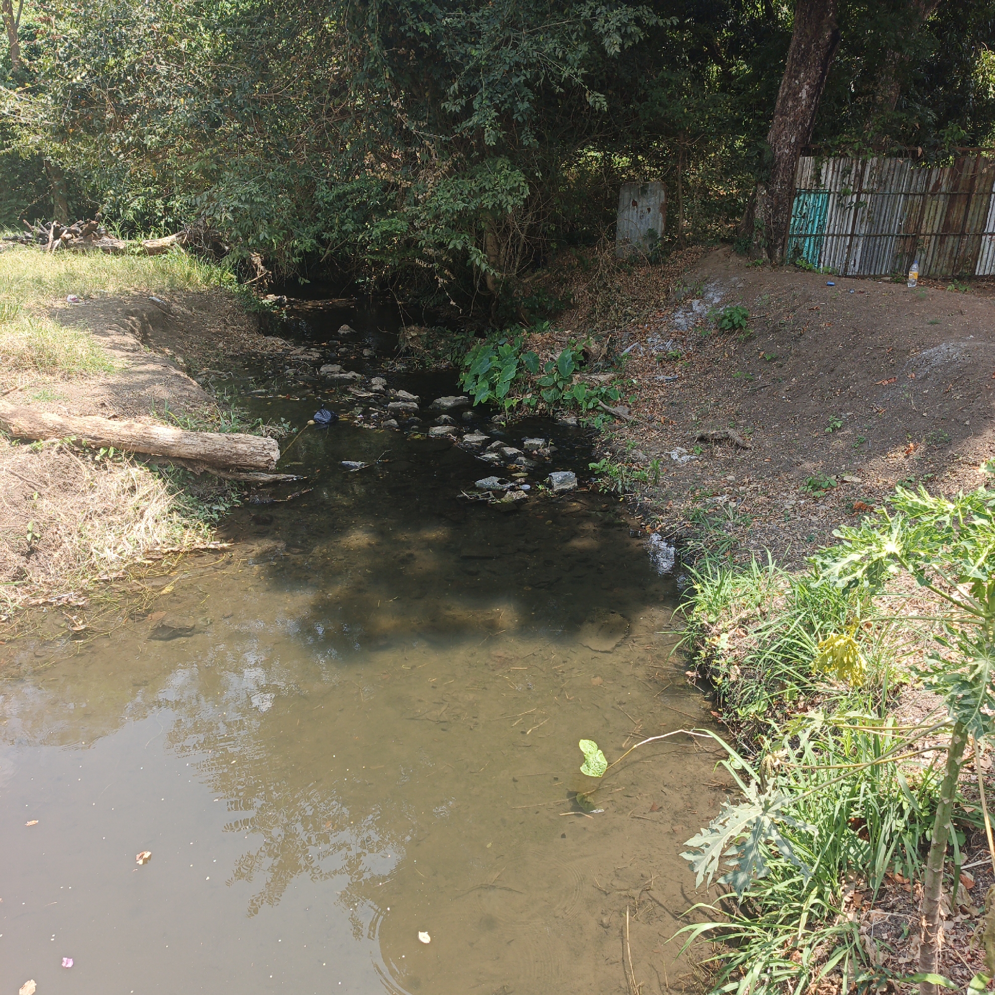 This image displays a shallow, muddy stream or ditch in Vallecito, Venezuela, approximately 3-4 meters wide. The water exhibits a brown-green hue, reflecting sunlight and overhead foliage. The streambed is visible in shallower sections, revealing rocks and debris. The left bank features an earthen slope covered with sparse, dry grass and some green vegetation. A debarked log, approximately 2 meters in length, lies horizontally on this bank, with one end extending towards the water. White plastic debris is scattered near the log. The right bank is an earthen slope supporting a mix of green grass, broad-leafed plants, and fallen leaves. A young papaya plant is visible in the foreground. In the mid-ground, a weathered, rectangular concrete pillar stands partially obscured by dense green foliage. Adjacent to this, a corrugated metal fence, composed of panels exhibiting green-blue and rusty silver coloration, forms a boundary. A yellow plastic bottle stands upright on the dirt ground near the fence. Dense green trees and bushes frame the background on both sides of the stream. Additional refuse, including a black plastic bag, is floating in the water. No individuals, actions, or direct interactions are visible within the scene.