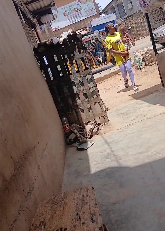 A woman in a yellow t-shirt and white pants walks into the frame carrying a baby. They are walking on a sidewalk that leads to a street with buildings and vehicles visible in the background. The sidewalk is sheltered by corrugated metal roofing. A structure constructed of metal mesh stands near the sidewalk.