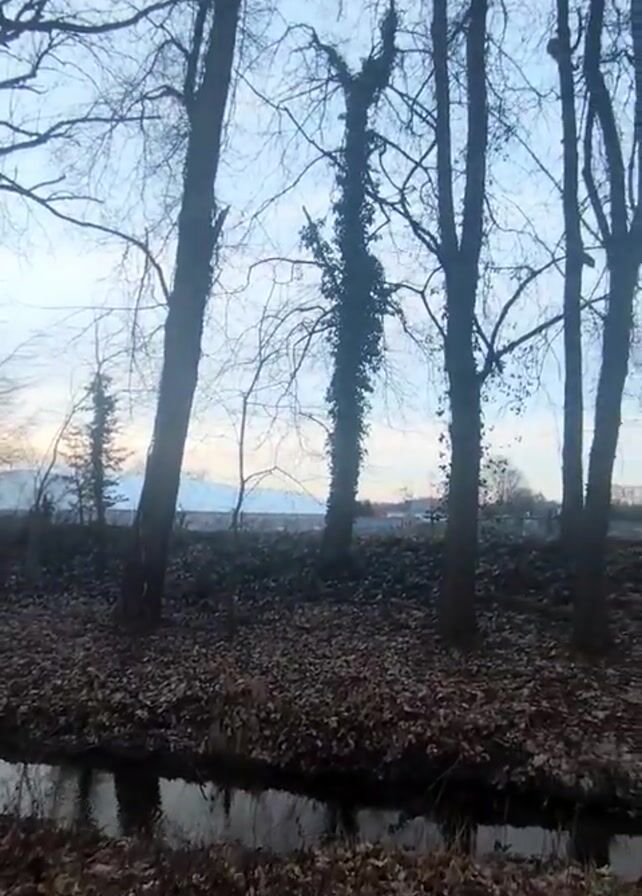 small stream flowing through a wooded area covered with fallen leaves. Several tall, bare trees are visible, with one partially covered in ivy. In the background, indistinct shapes suggest buildings or other structures, possibly with snow on the ground. The sky is overcast. No people or animals are clearly visible.
