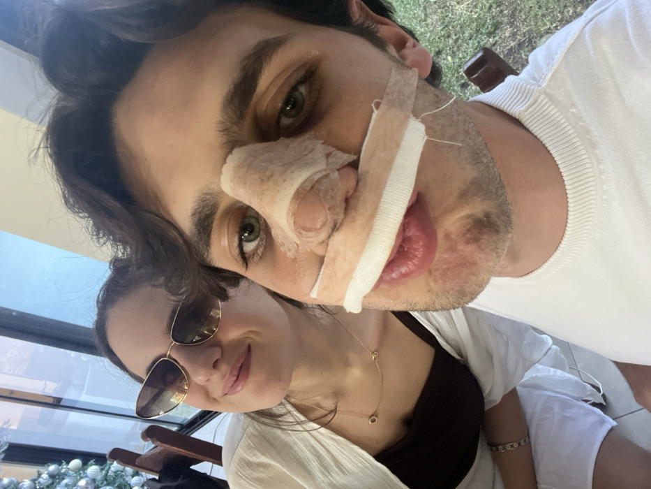 A selfie captures a man and a woman. The man's nose is covered in bandages, indicating a medical procedure. He has dark hair, green eyes, and stubble. The woman wears sunglasses and a white cardigan over a black top, with a delicate necklace. Both appear to be sitting, with glimpses of a decorated area in the background. They are close together, posing for the photo.