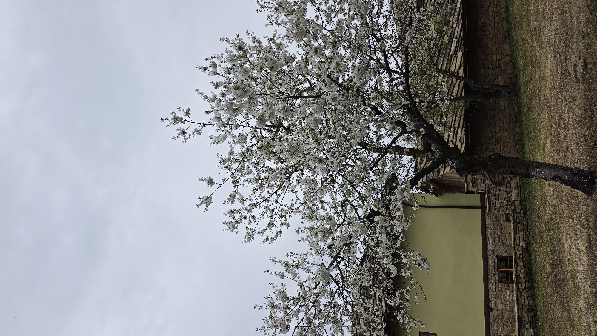The image depicts a blossoming tree with white flowers in front of a building, likely in Balaleia, Bulgaria. The sky is overcast. The building has a stone and wood structure, with sections painted in a light olive green. The tree trunk is dark and gnarled. The area surrounding the building appears to be a yard with grass or vegetation.