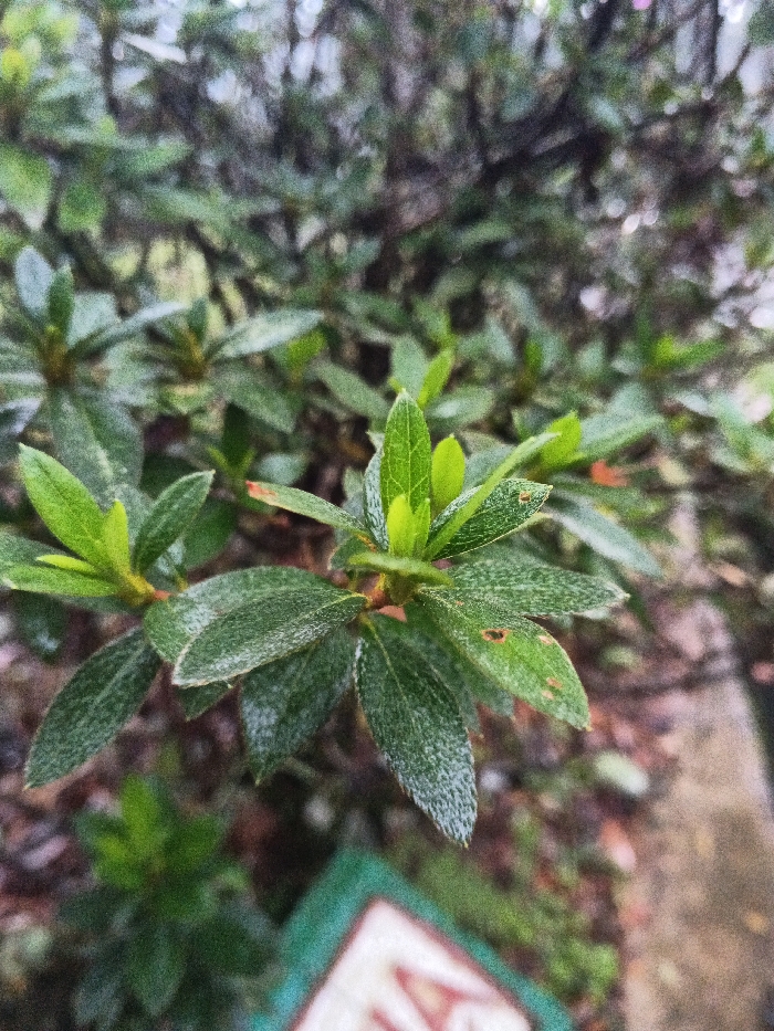 A close-up shot showcases a cluster of dark green leaves with prominent veins and light speckling. New, vibrant green shoots emerge from the center of the cluster. Some leaves exhibit small brown spots. The background features a dense shrub with similar foliage, softly blurred. A green-framed sign with faded red and white lettering is partially visible in the lower foreground. The scene is natural and suggests a garden or outdoor setting.