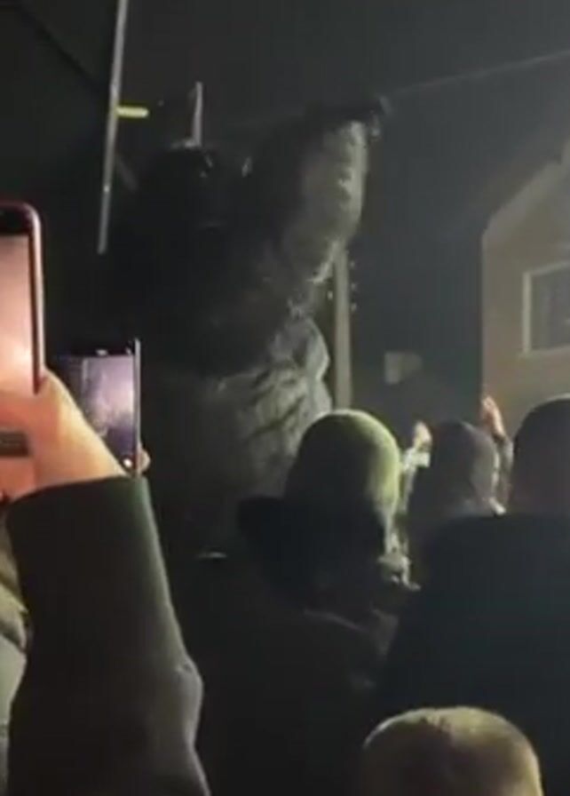 A crowd of people, mostly wearing dark jackets and hats, are gathered outside at night, illuminated by bright lights. They are looking up at a person in a large, ape-like costume standing on an elevated platform. Some people in the crowd are holding up their phones to record or take pictures of the costumed figure. The ape-like figure raises its arms, as if in celebration. Fireworks can be heard in the background. A house is visible in the background to the right of the screen.