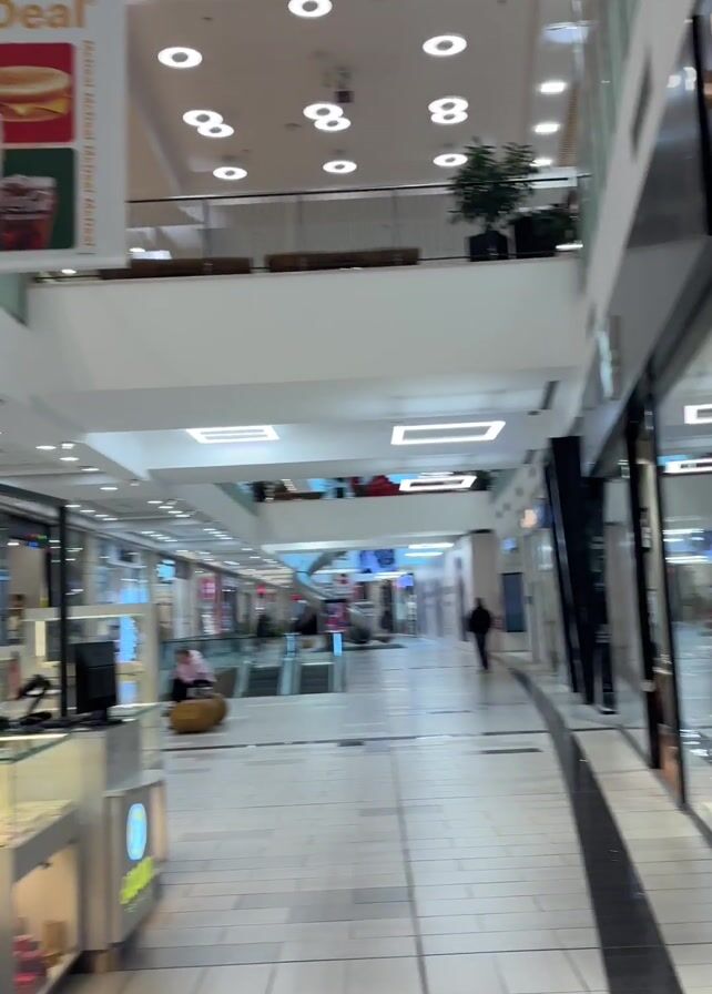 The camera moves through a bright, mostly empty shopping mall