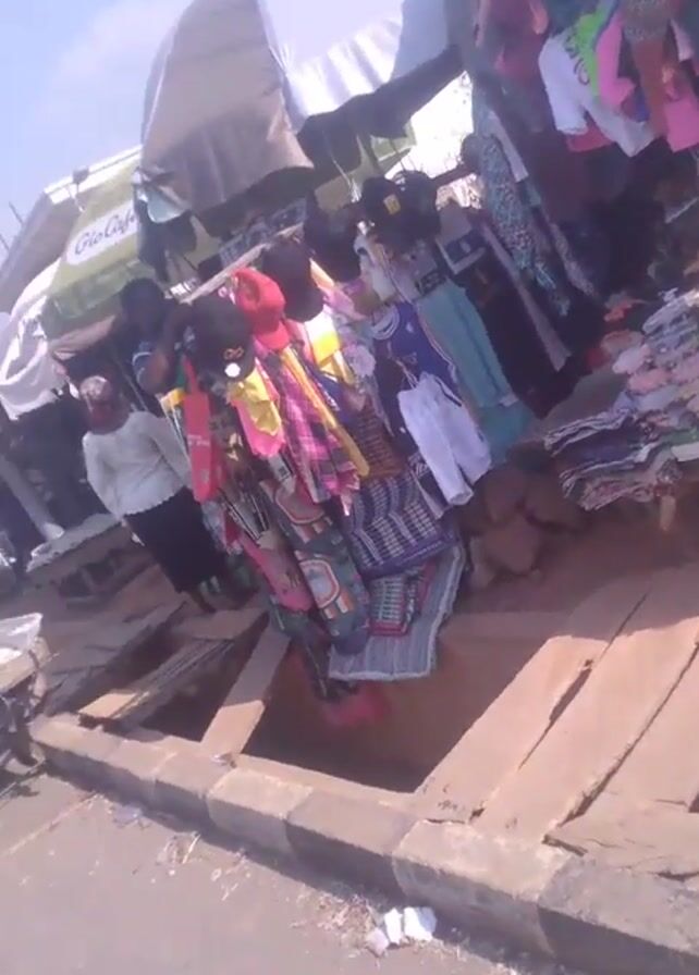 street market scene on a sunny day. There are multiple vendors with stalls selling goods such as clothing and phone accessories. People are walking along the sidewalk and crossing the street. A cart filled with white items, possibly yams, sits on the side of the road. A motorcyclist drives past on the road. There's a bridge visible in the background. The overall atmosphere is busy and typical of a marketplace.