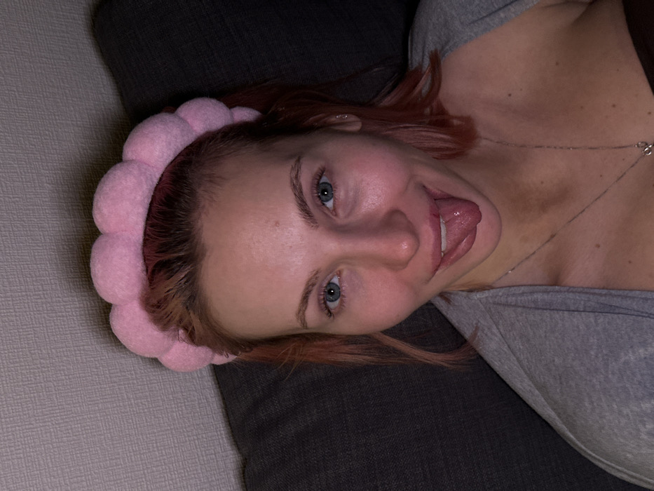 An indoor scene in Novoe Devyatkino, Russia, depicts a young adult female from the chest up, positioned slightly off-center and looking directly at the camera. She has blue eyes, light skin, and shoulder-length reddish-blonde hair pulled back by a soft, pink, puffy headband resembling connected spheres. She wears a light grey open cardigan or robe over an unidentifiable dark garment, and a thin silver chain necklace with a small pendant rests on her chest. Her left ear displays a small silver stud earring. The subject's mouth is open, and her tongue is extended slightly downwards and to her right. She is seated on or leaning against a dark grey upholstered sofa or couch, partially visible to the left and behind her. The background shows a light-colored wall with a subtle textured pattern. Artificial lighting illuminates the scene.
