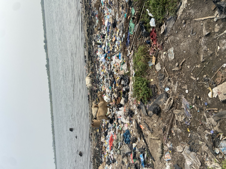 This image presents a polluted waterfront scene in Igbologun, Nigeria