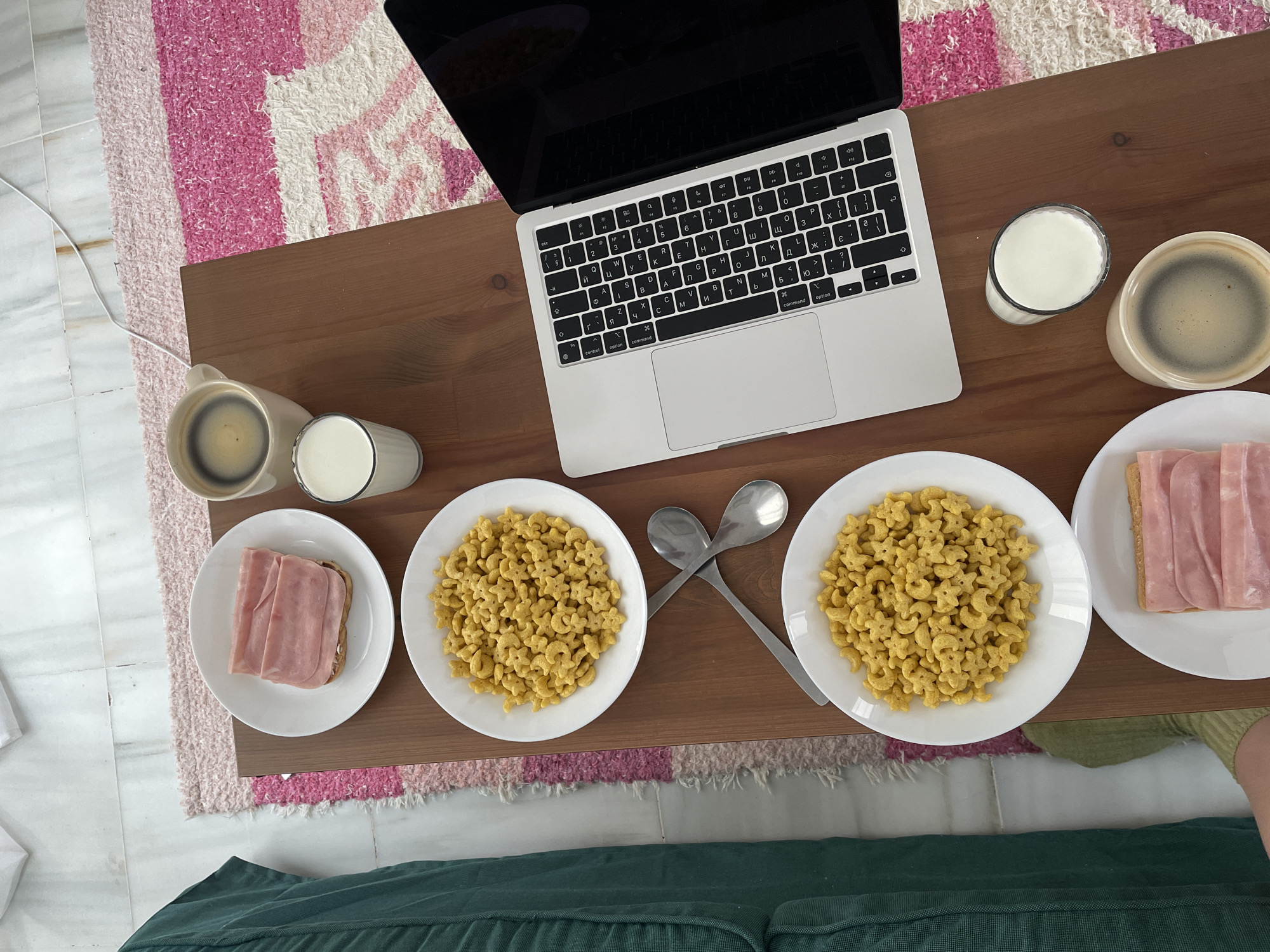 - "This overhead image depicts a meal setup for two individuals on a reddish-brown wooden coffee table in an indoor residential setting in Málaga, Spain" by FM-yO6Bi1, licensed under CC BY 4.0