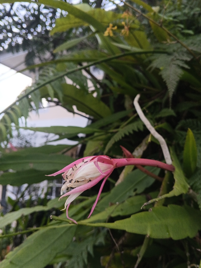 A close-up photograph taken in São Félix do Xingu, Brazil, captures a pink and white flower, resembling a night-blooming cereus, amidst lush green foliage. The flower displays vibrant pink outer petals transitioning to lighter, almost white, inner petals, and appears to be in a state of partial bloom or early wilting. Multiple small black ants are actively observed crawling across the white inner petal surfaces. The flower is supported by a thick, dark pink stem. To the right of the flower, a slender, light-colored, curved stem or tendril extends upwards. The immediate environment consists of dense green vegetation, including broad leaves and serrated fern fronds. In the blurred background, a light-colored building with a dark roofline is partially visible on the upper left, indicating an urban or suburban outdoor setting.