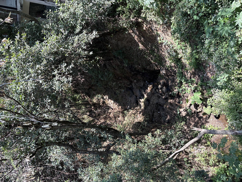 This image depicts a deep, vegetated gully or ravine within the city of Tetela Del Monte, Mexico. The gully features steep, earthen banks densely covered with green trees and diverse undergrowth. The bottom of the depression contains loose soil, scattered rocks, and small, dark patches consistent with minimal water or damp earth, indicating a natural drainage course or dry creek bed. Sunlight illuminates various sections of the foliage and ground, creating a pattern of bright areas and deep shadows. No individuals, animals, or active human interactions are present. In the upper right quadrant of the scene, a partial view of a light-colored, multi-story concrete building, appearing to be unfinished or in a state of disrepair with dark, empty window or door frames, is visible through the tree canopy.